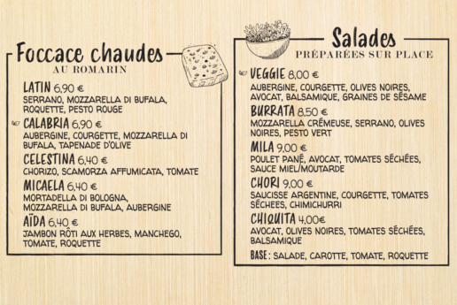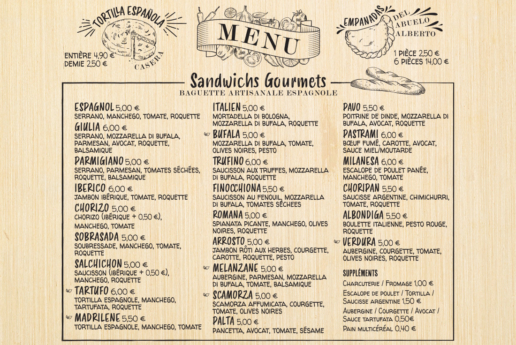Vanessa m’a contacté pour voir ensemble comment mettre en valeur le menu de sa sandwicherie. Elle dispose en effet de grands murs au dessus de son étale et elle souhaitait y installer des panneaux de bois imprimés. Venant tout droit d’Argentine, elle voulait quelque chose qui inspire l’authenticité et la gourmandise. J’ai réalisé plusieurs illustrations à la main et retravaillé d’autre venues d’une banque d’image, afin de réduire le coût du projet. Le résultat était grandiose ! Malheureusement, les prix avaient été imprimés dessus et aujourd’hui, ils ne sont plus d’actualité. C’est donc important de tenir compte de ce facteur pour ce type de projet.